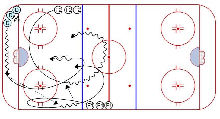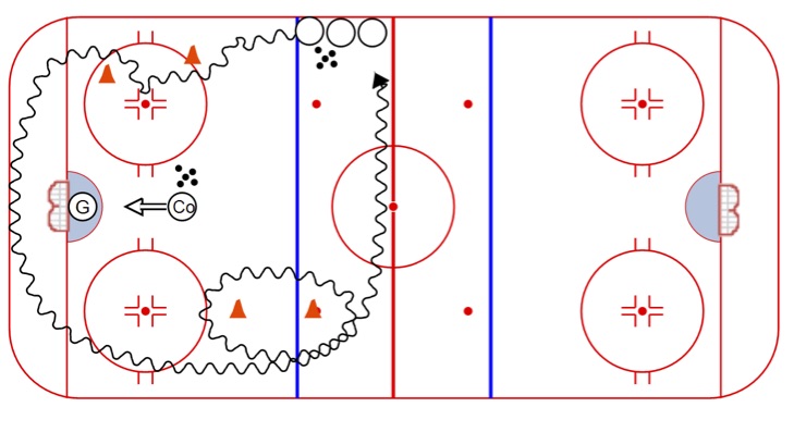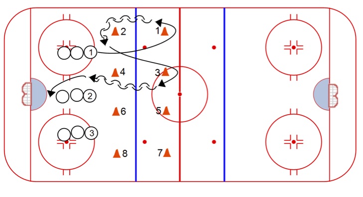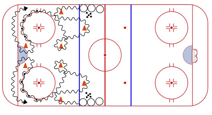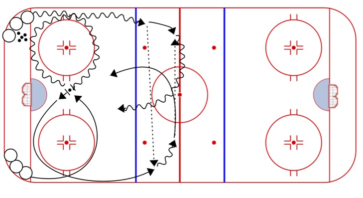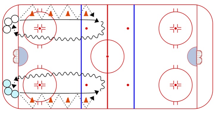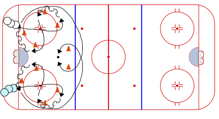 Criss Cross Pivots: A solid skating drill with 3 players working at the same time. Minimal time waiting in line.